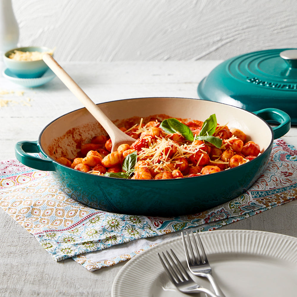 The Baccarat® Le Connoisseur™ Cast Iron French Saute Pan is a stunning piece of cast iron cookware. With its elegant teal hue and heavy weight construction it will become a timeless classic in your kitchen. Made from cast iron it has a double layer enamel surface, which is easy to clean and does not require seasoning. The Baccarat® Le Connoisseur™ Cast Iron French Saute Pan 31cm is suitable for use with all cooktops including induction and is oven (up to 200 degrees Celsius) and dishwasher safe for your convenience, although hand washing is recommended. With a matching lid, the saute pan allows you to create a multitude of delicious dishes. The self-basting lid features spikes on the inside of the lid that work to collect moisture and drip it back into the dish, resulting in juicy and succulent meals. The handles on the Baccarat® Le Connoisseur™ Cast Iron French Saute Pan are easy to lift and an industry standard Bakelite knob plus a stainless-steel knob are included with your pan.